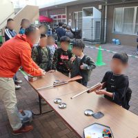 リコージャパンの竹笛作りコーナーに子どもたち興味津々