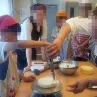 今年度最初の料理塾です。早速頂いたコックコートを着用して準備します。今回はショートケーキとロールケーキを作りました。 生クリームをヘラで塗る段階で、その場を笑いに包む発言があったりと和む場面もありました。 調理師学校に通っている児童は、パティシエの方と2人で話をしている姿を多々見かけました。 昼食後の反省会では、料理人の方やパティシエの方が真剣な話をされ、一生懸命聞いていました。