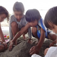 海の公園で砂遊びしている、子どもたちの様子です。 楽しそうですね。