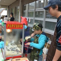ポップコーン、子ども店員さんを職員さんが見守っています。