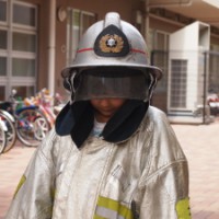 消防署から消防車が来ての防災訓練で、消防服を着せて貰いました。