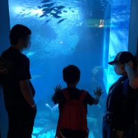 水族館を巡る。水族館の中では非日常の雰囲気に気持ちが昂ぶっていたようです。 昼は園内のフードコートで昼食を摂りました。食後は巨大迷路、鏡迷路、最後はロッククライミングに挑戦。 夜のBBQ、花火で、楽しいことだらけの旅行でした。